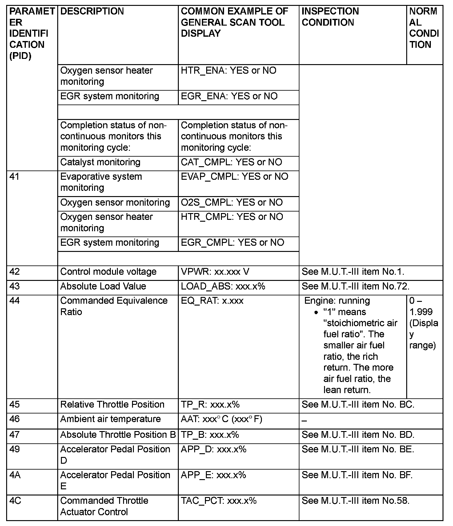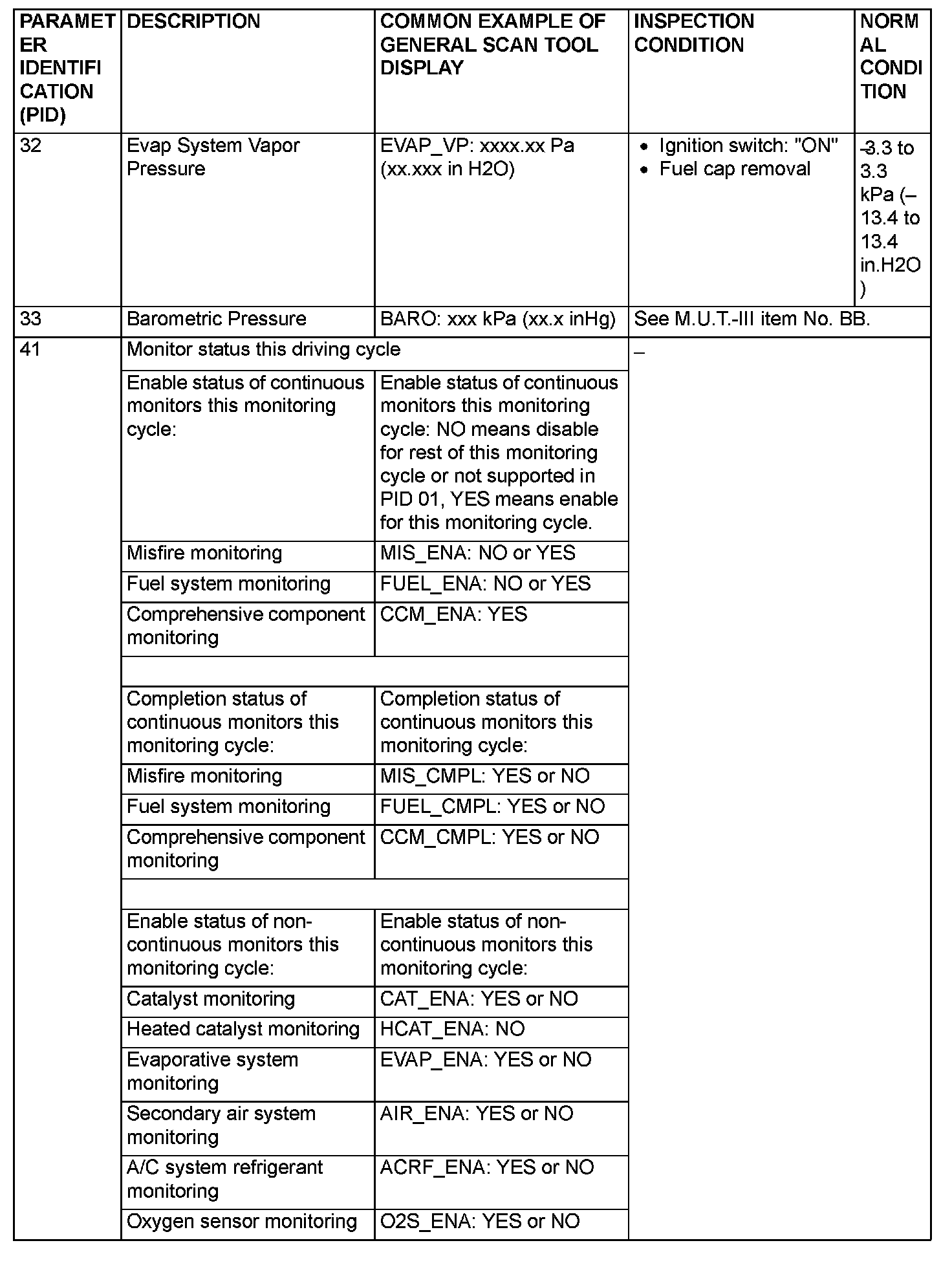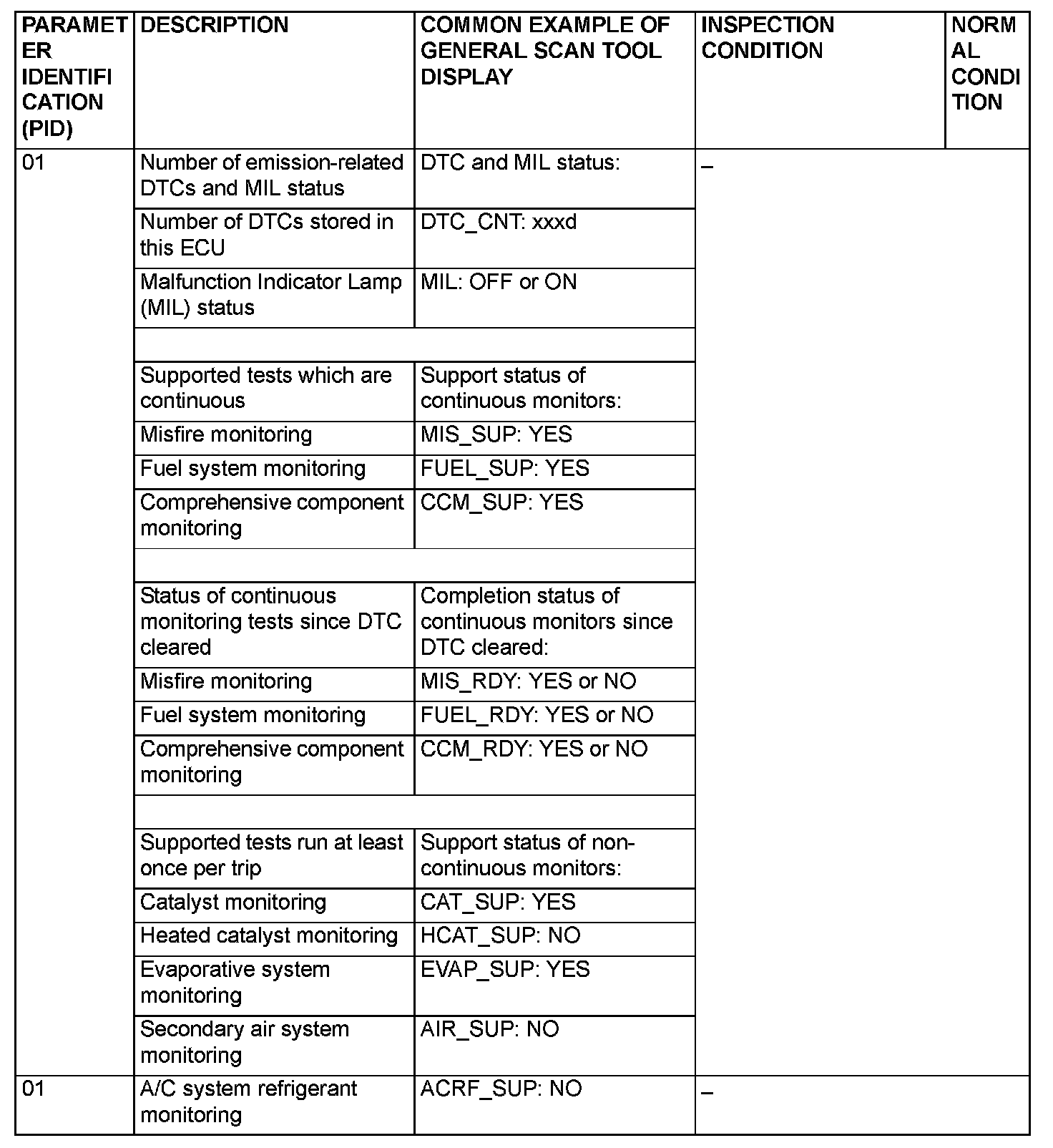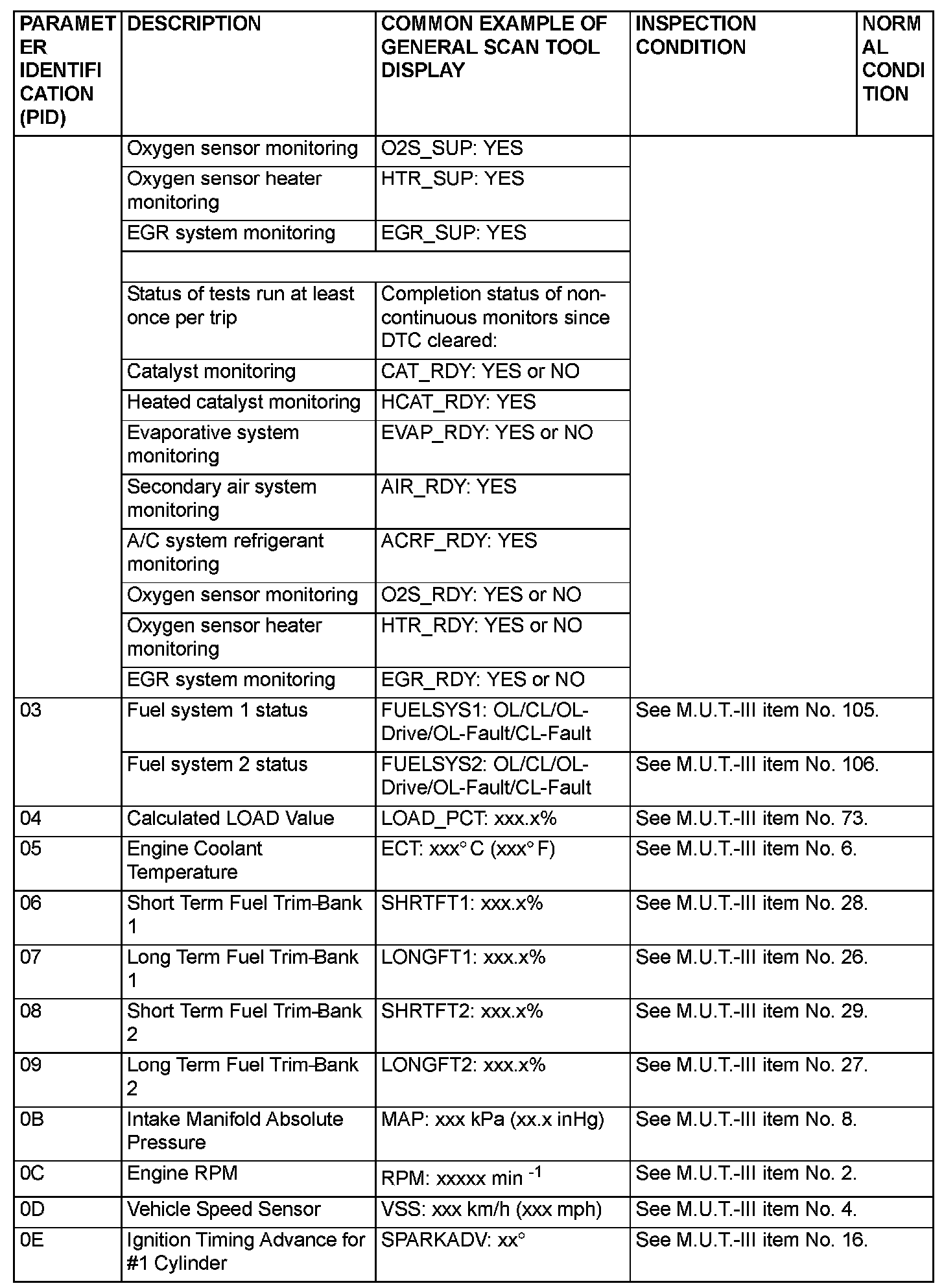 GENERAL SCAN TOOL (GST) MODE 01 REFERENCE TABLEThe purpose of this service of to allow access to current emission-related data values, including analogue inputs and outputs, digital inputs and outputs, and system status information.