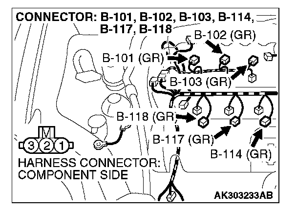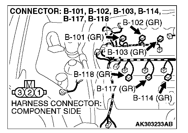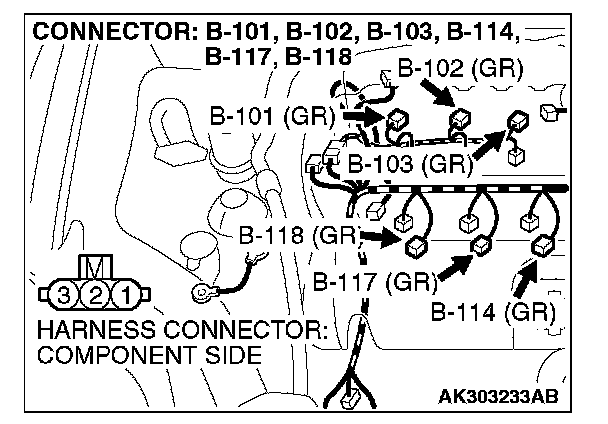 1. Disconnect the connectors B-101, B-102, B-103, B-114, B-117, B-118 and measure at the harness side.