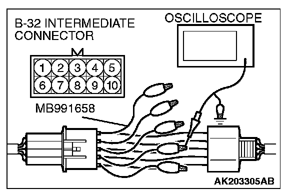1. Disconnect the intermediate connector B-32, and connect the test harness special tool (MB991658) between the separated connector.