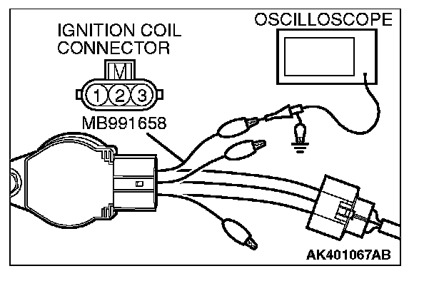 1. Disconnect the ignition coil connector, and connect test harness special tool (MB991658) between the separated connector. (All terminals should be connected.)
