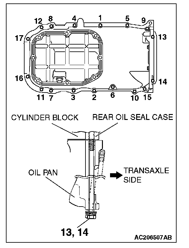 CAUTION: The bolt holes for bolts 13 and 14 in the illustration are cut away on the transaxle side. Be careful not to insert these bolts at an angle.