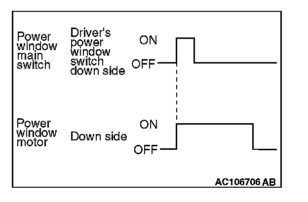 When the driver's power window switch on the power window main switch is pushed down fully, the system energizes its respective power window motor, and then driver's window glass moves to its lowest position.