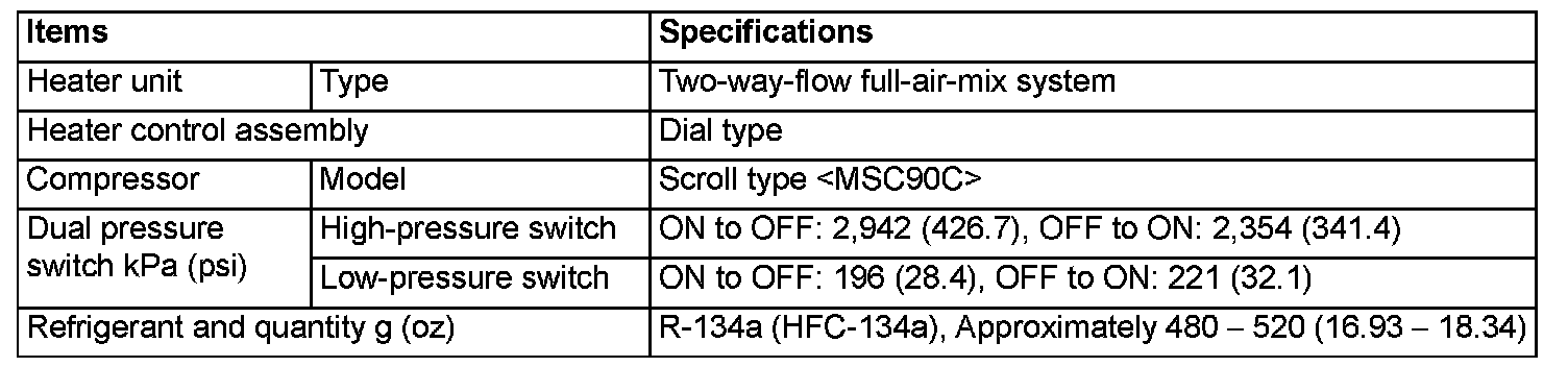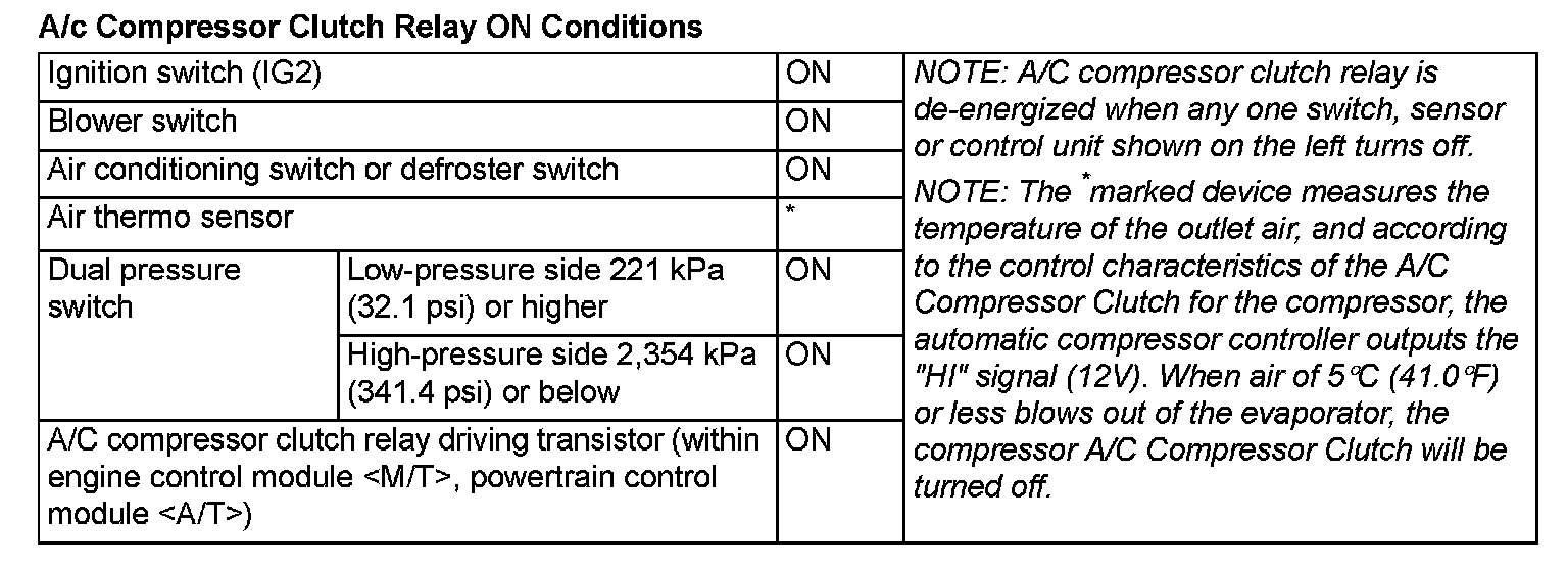 - The dual pressure switch turns OFF when the refrigerant pressure becomes excessively high or low, thus protecting the compressor circuit. (See table.)