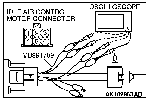 2. Connect the oscilloscope probe to the idle air control motor connector terminal No. 1, terminal No. 3, terminal No. 4 and terminal No. 6 respectively.