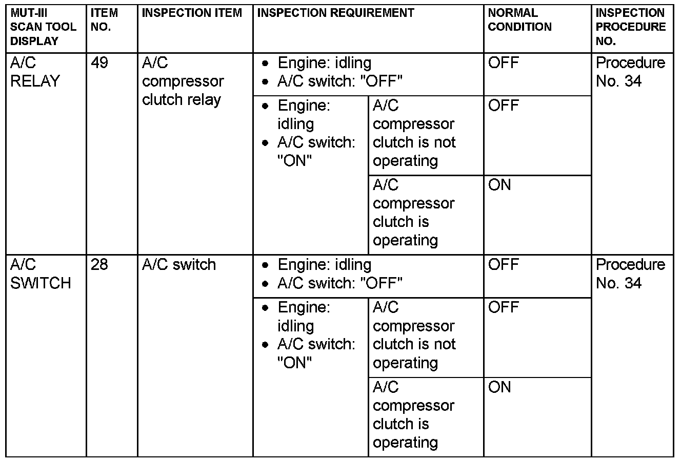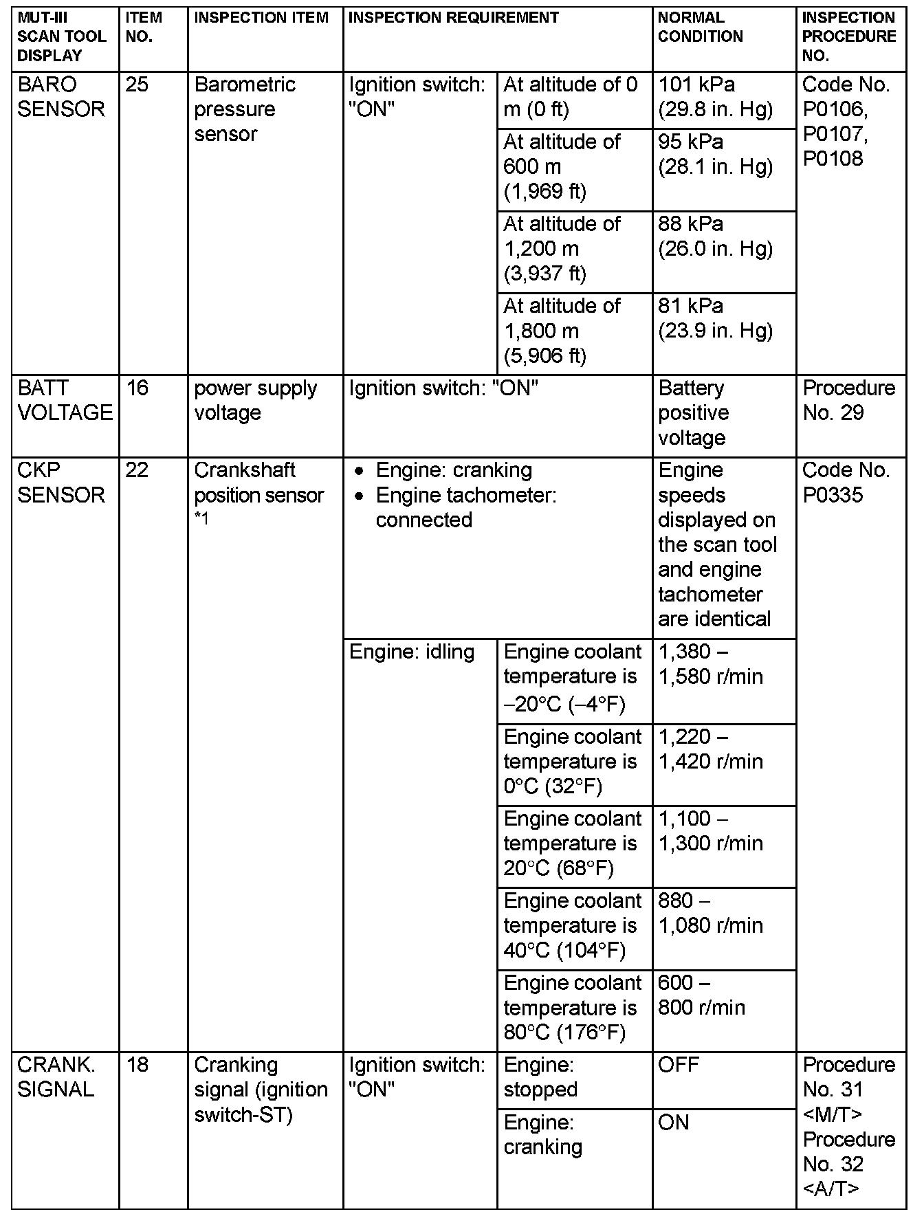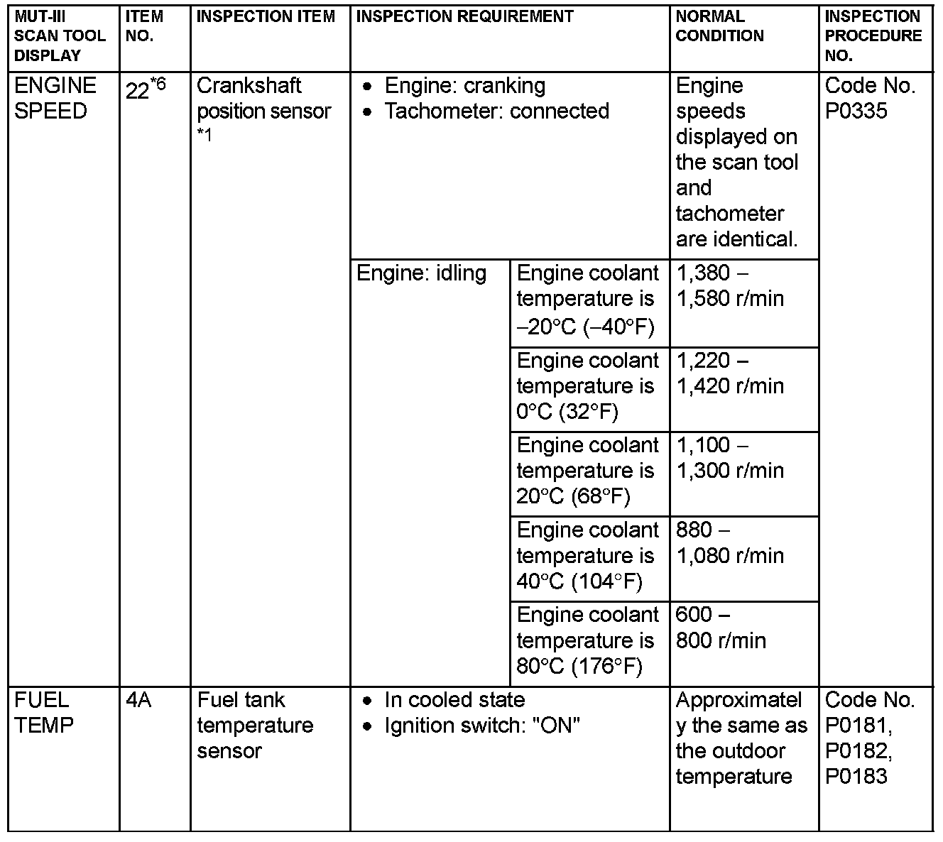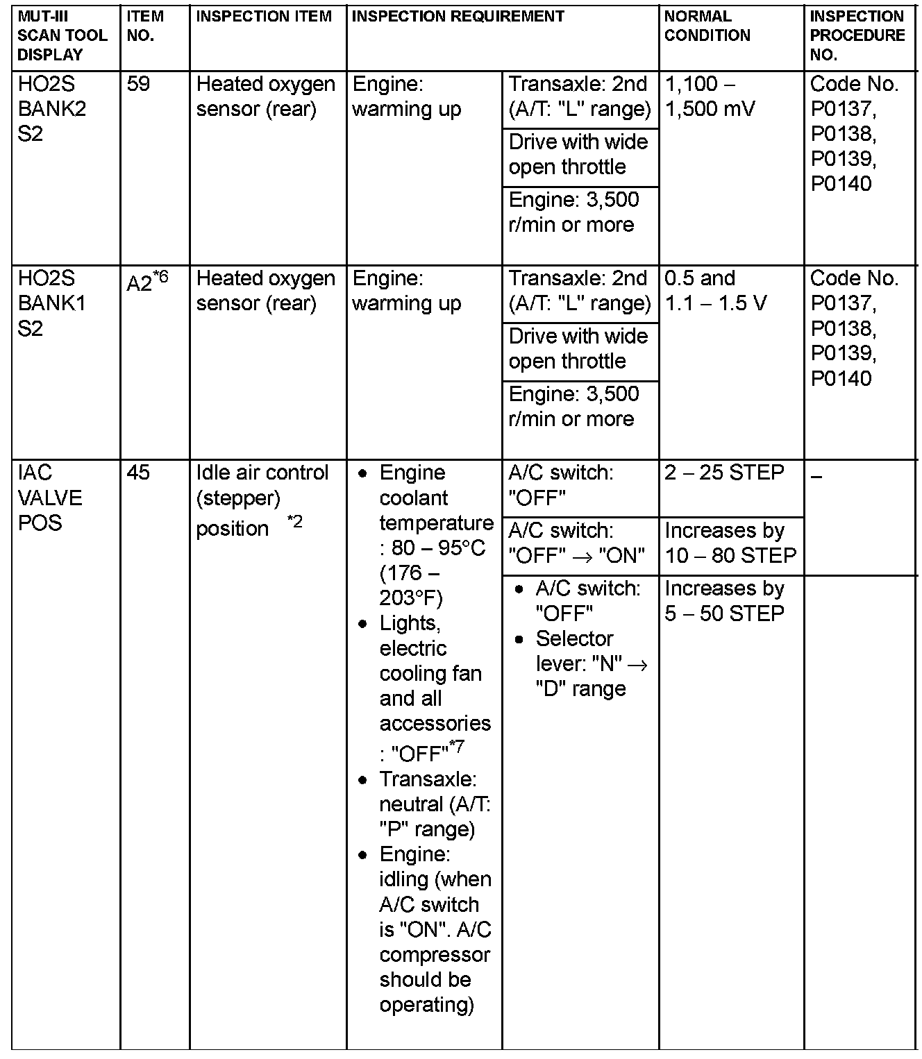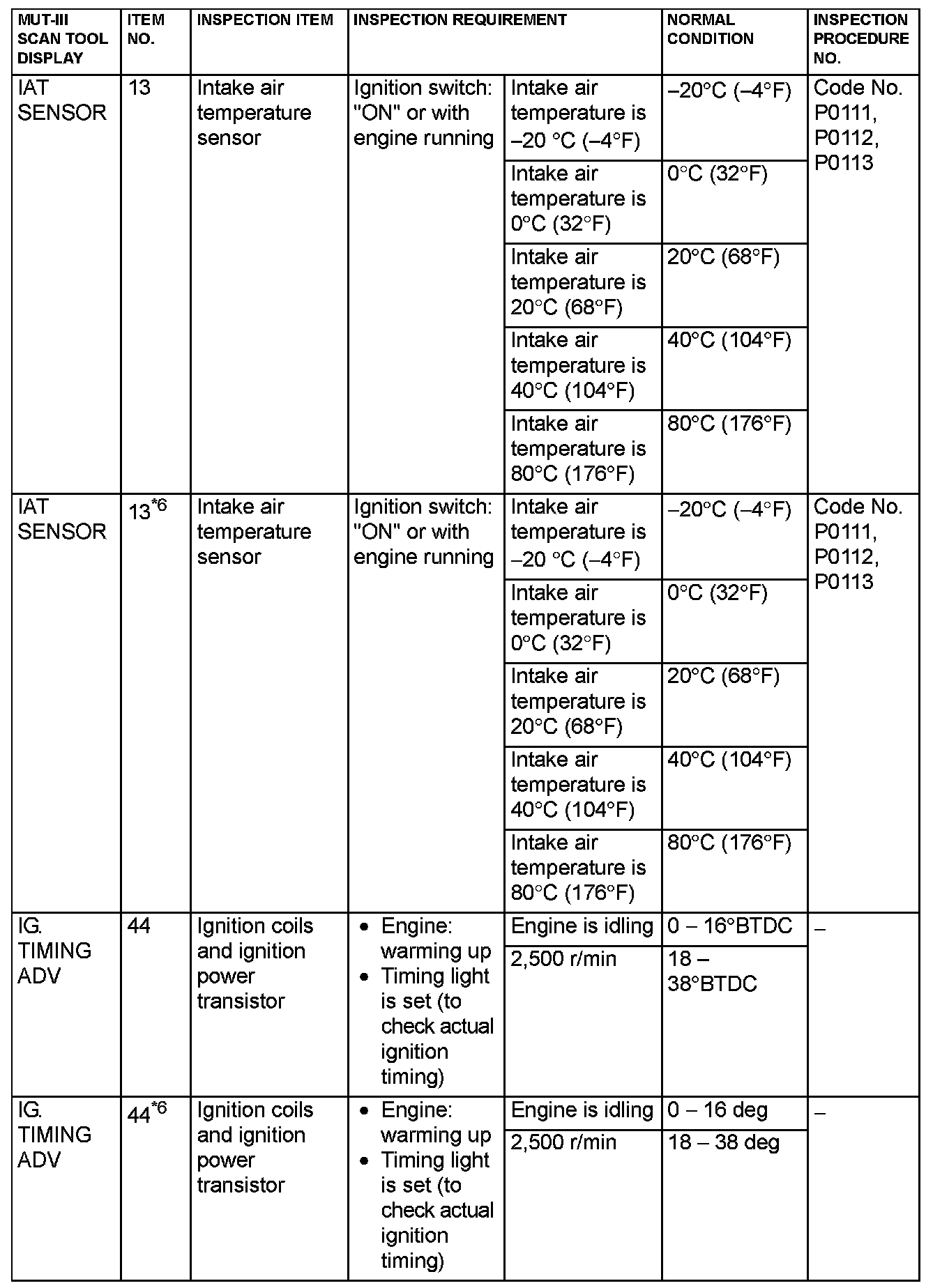 NOTE: *6: GST items. [Data list items consist of MUT-III items and GST items. GST items can be accessed through the use of a general scan tool (GST). When scan tool MB991958 (MUT-III sub assembly) is used, MUT-III items appear alphabetically; then, GST items appear alphabetically. The black and white characters of the GST items are inverted from the MUT-III items.]