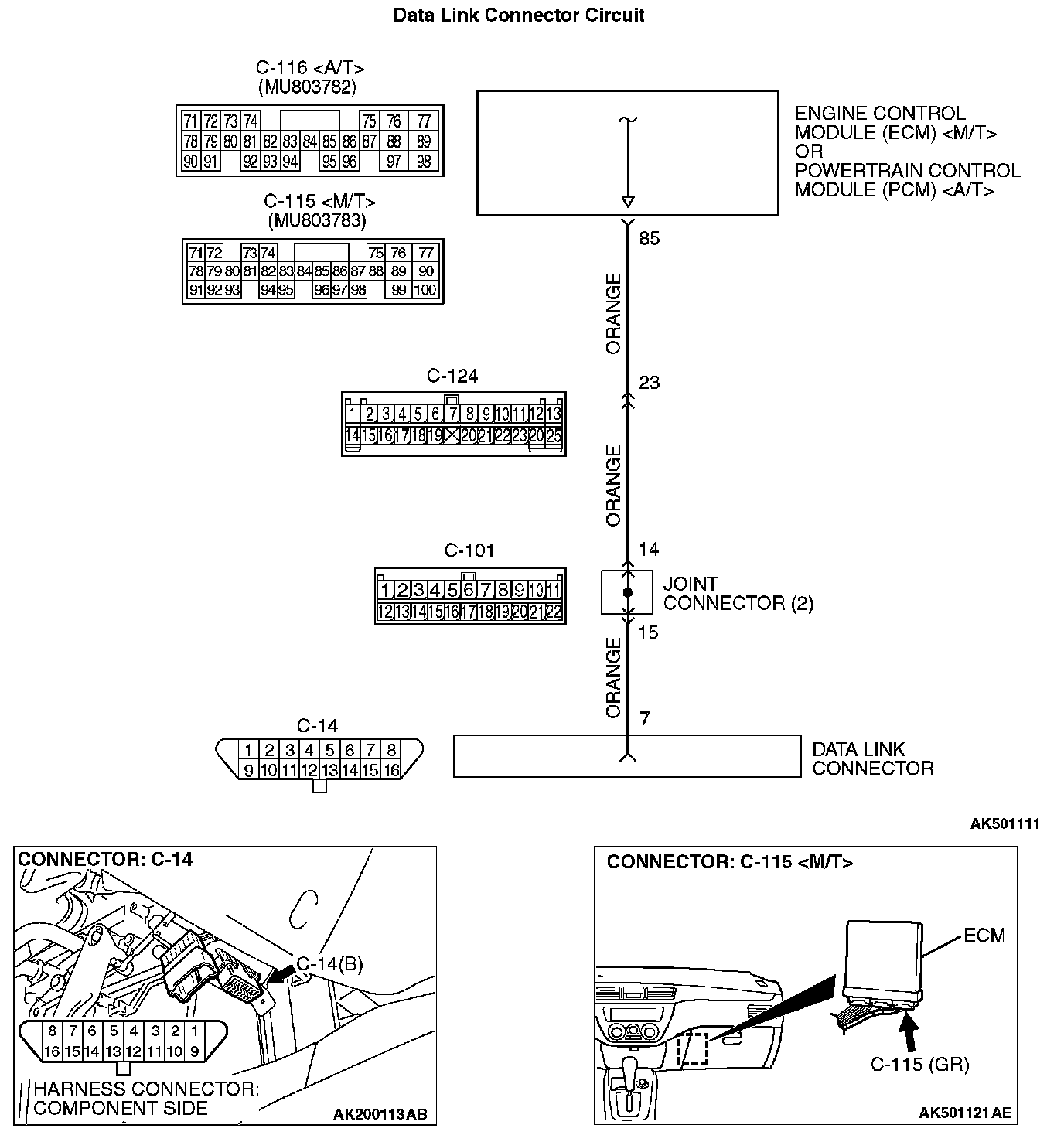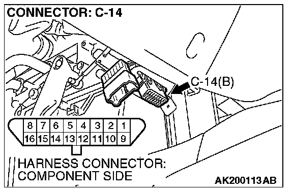STEP 2. Check for open circuit, short circuit to ground and harness damage between data link connector C-14 (terminal No. 7) and ECM connector C-115