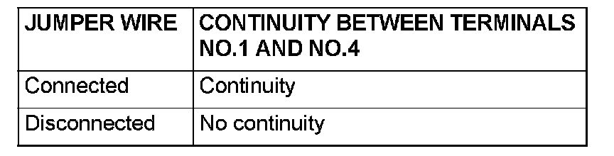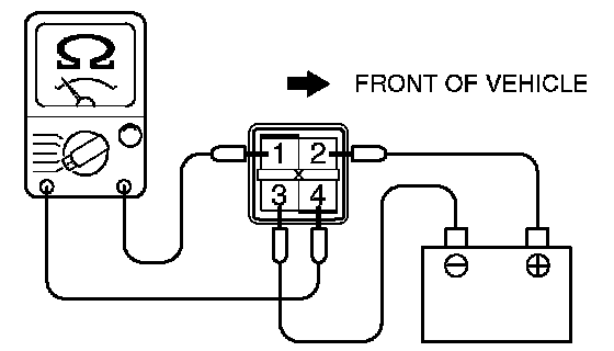 3. Check for continuity between A/T control relay terminals 1 and 4 when the jumper wires are connected to and disconnected from the battery.