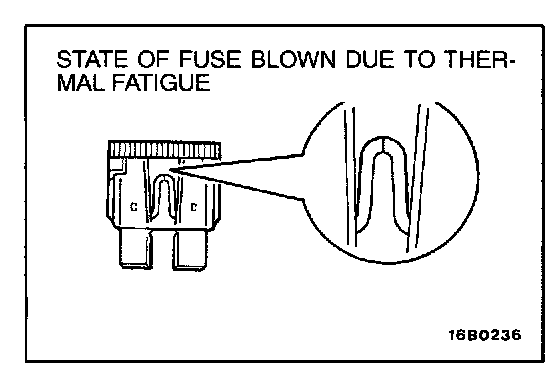 When a fuse is blown, there are two probable causes as follows: One is that it is blown due to flow of current exceeding its rating. The other is that it is blown due to repeated on/off current flowing through it. Which of the two causes is responsible can be easily determined by visual check as described below.