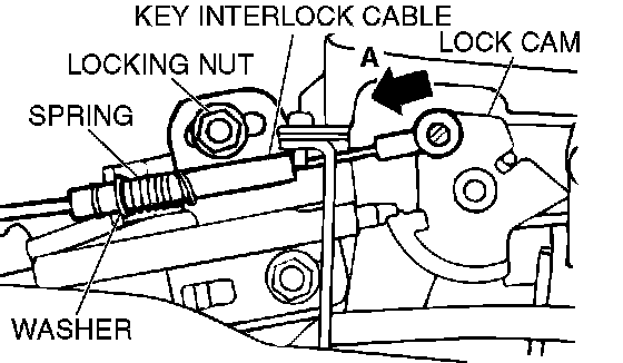 4. Lightly push the key interlock cable into the key interlock cable housing toward the arrow (A) direction until the cable movement stops and the cable end eye is aligned with the shaft on the lock cam. Tighten the locking nut. Snap the cable end eye onto the shaft of the lock cam.