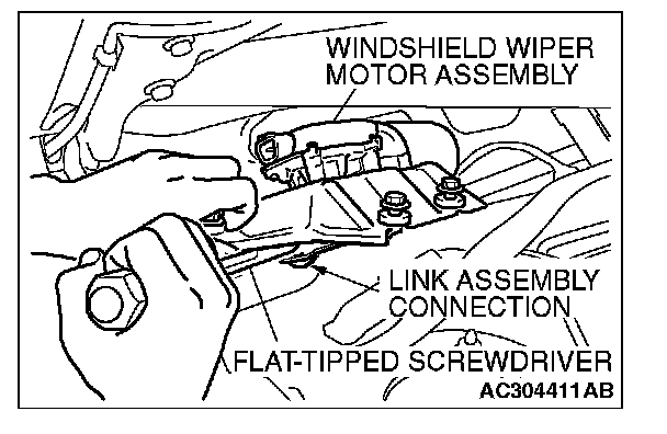 2. Use a flat-tipped screwdriver to disengage the link between the windshield wiper motor assembly and the link assembly to remove the windshield wiper motor assembly.