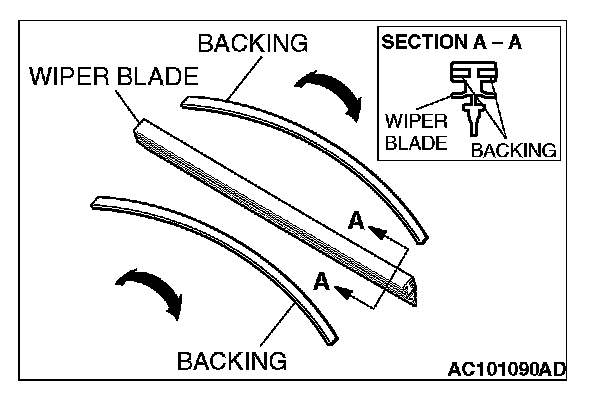 When installing the passenger's wiper blade, check that the backing inside the wiper blade is warped toward the wiper arm.