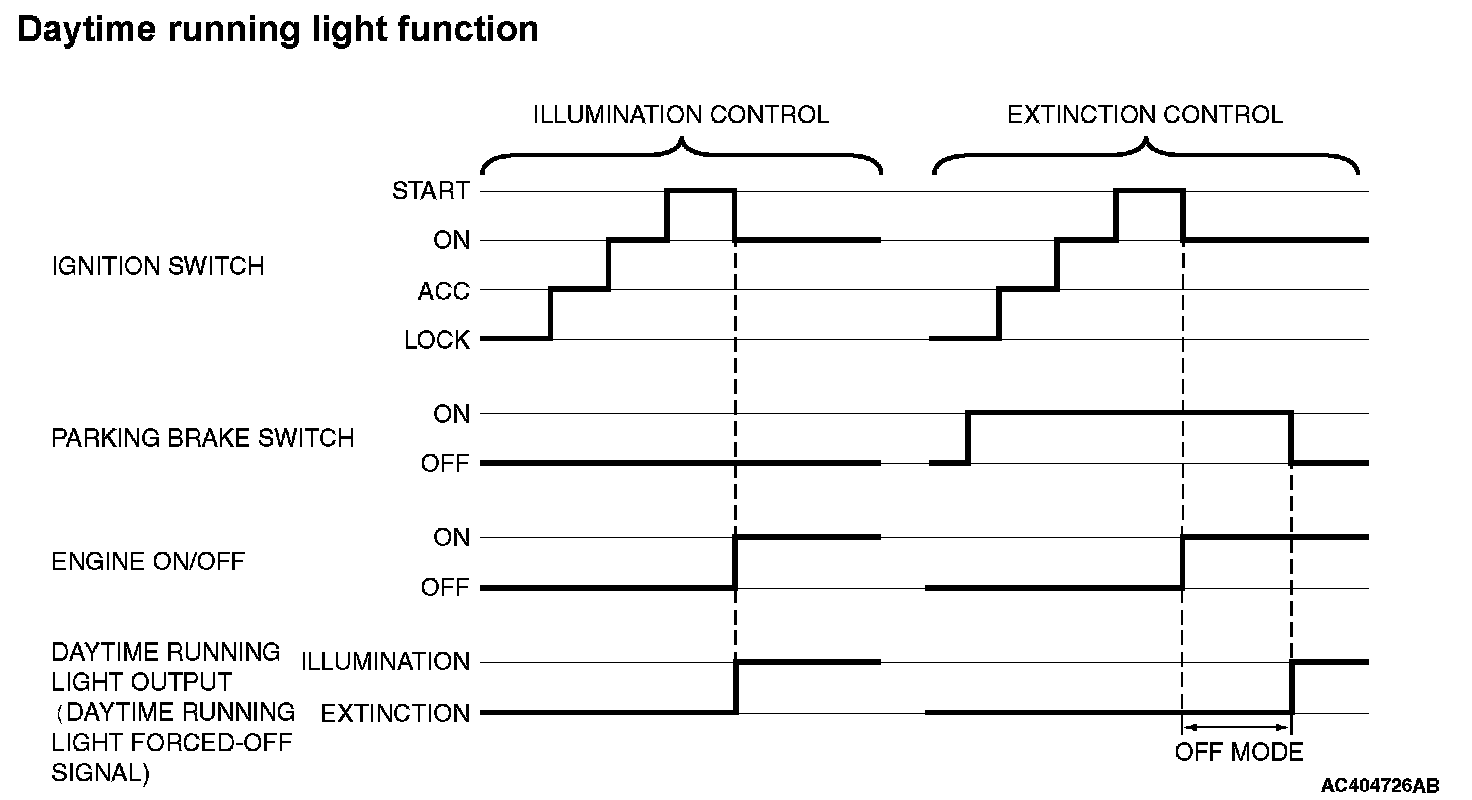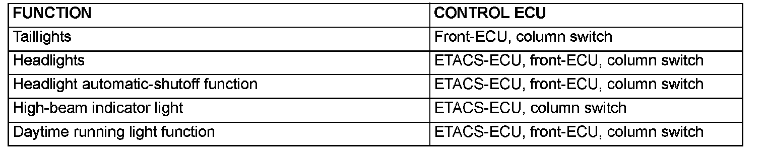 The ETACS-ECU outputs the daytime running light forced-OFF signal to the front-ECU based on the input signal sent via CAN communication. The front-ECU controls illumination and extinction of the daytime running light according to the daytime running light forced-OFF signal.
