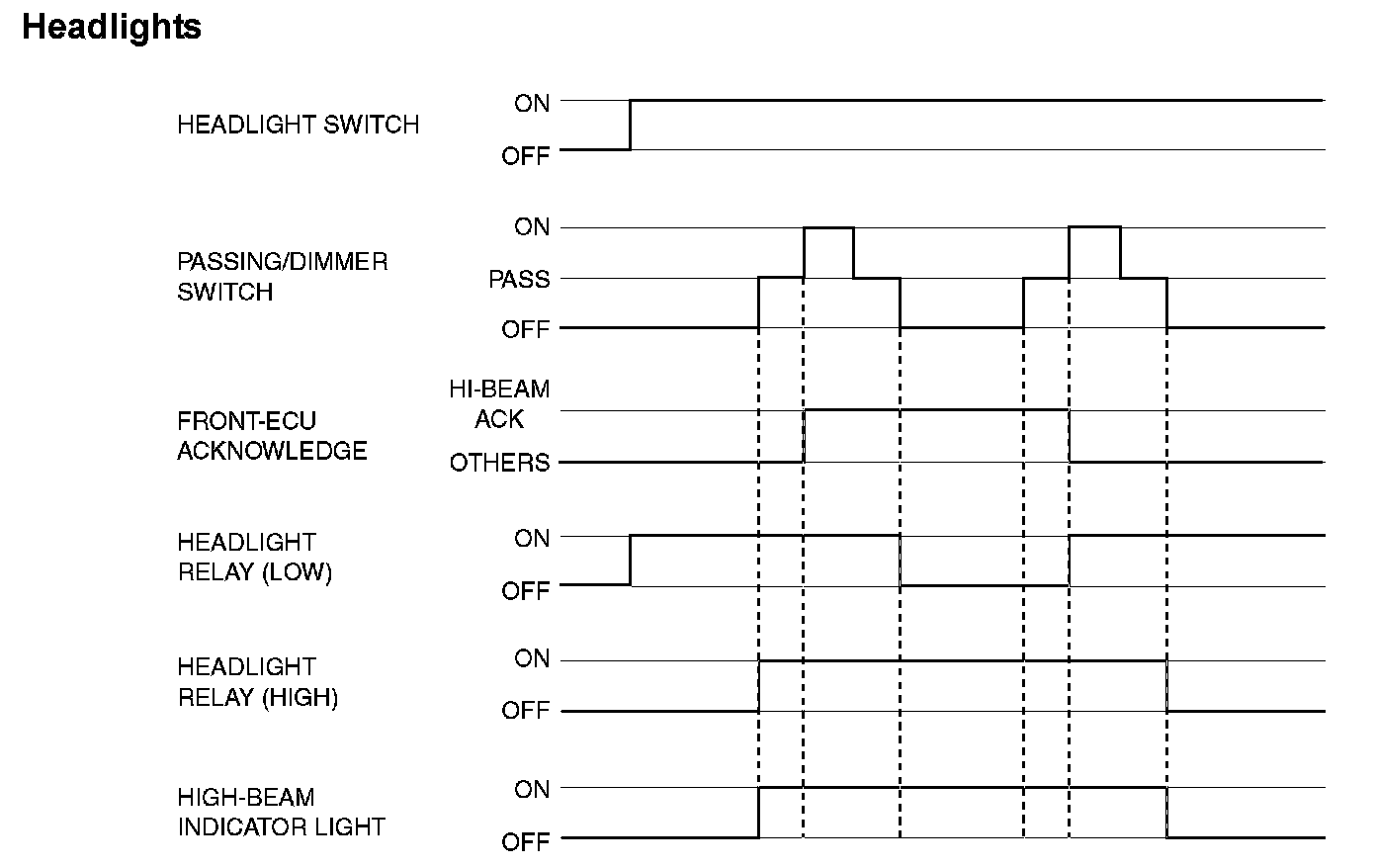If the column switch sends a headlight switch "ON" signal to the front-ECU, the front-ECU turns on its headlight relay (LOW), causing the low-beam headlights to illuminate. If the dimmer switch is turned on while the headlight relay (LOW) is on, the front-ECU turns on the headlight relay (HIGH), causing the high-beam headlights to illuminate.
