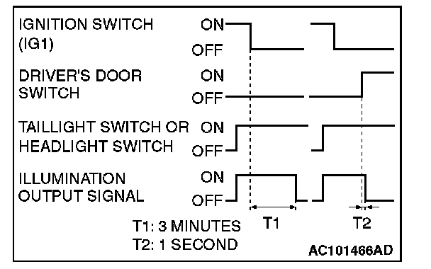 NOTE: The dotted lines indicate that lighting mode when the ignition switch is turned ON, door is locked, or any door is opened during the timer illumination time.