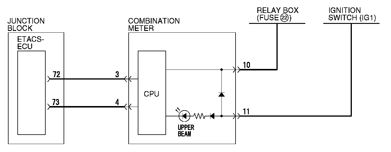 At the same time that the high-beams are illuminated, the ETACS-ECU sends a signal to illuminate the high-beam indicator via the CAN bus line. The combination meter receives the transmitted signal and turns the high-beam indicator on and off.