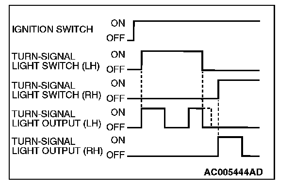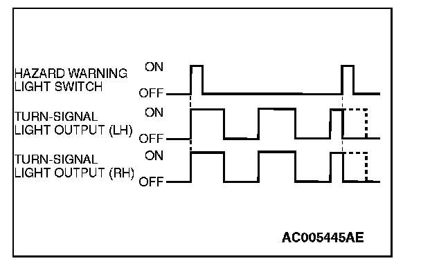 The turn-signal light output (flashing signal) is turned ON when the ignition switch is ON and the turn-signal light switch is ON (LH or RH). If the front or rear turn-signal light bulb has burned out, the flashing speed increases to indicate that the bulb has burned out.