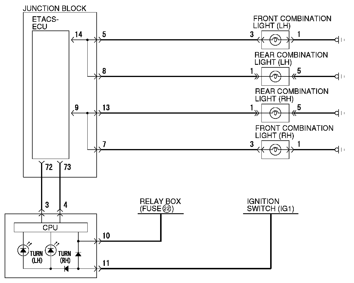 At the same time that the turn-signal lights are illuminated, the ETACS-ECU sends a signal to illuminate the turn-signal light indicator via the CAN bus line. The combination meter receives the transmitted signal and turns the turn-signal light indicator on and off.