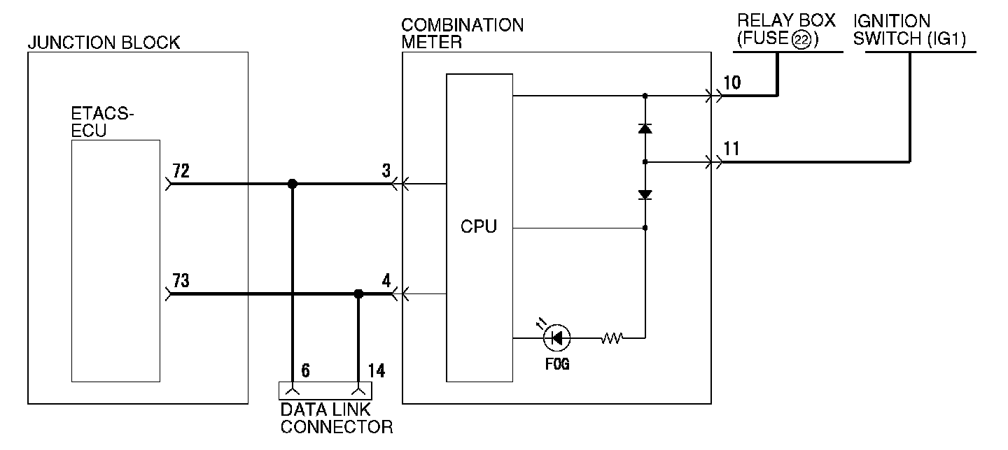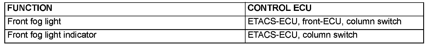 At the same time that the front fog lights are illuminated, the ETACS-ECU sends a signal to illuminate the front fog light indicator via the CAN bus line. The combination meter receives the transmitted signal and turns the front fog light indicator on and off.