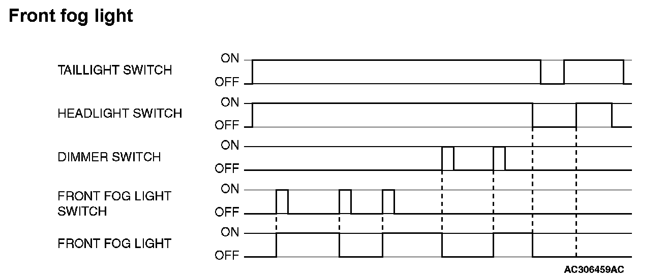 The front fog lights will be switched off when any of the following conditions are met. The front fog lights will also be switched off automatically by headlight automatic shutoff function.