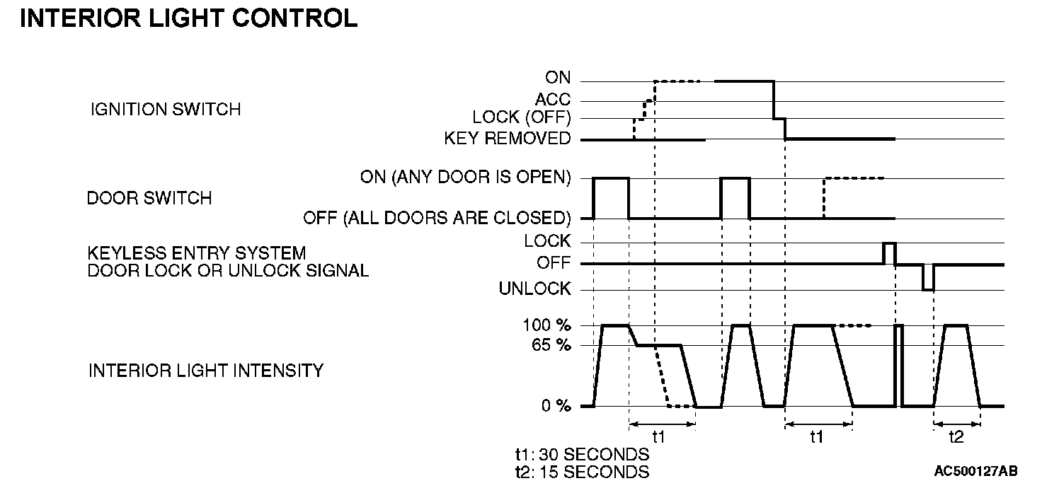 - When a door is opened with the ignition switch off, the interior lights up to a luminance of 100 percent. When a door is closed, the interior lights dim to a luminance of 65 percent, and go off 30 seconds later. However if the ignition switch is turned ON or if a door is locked while the interior lights are dimming, the dome light will go off at that point.