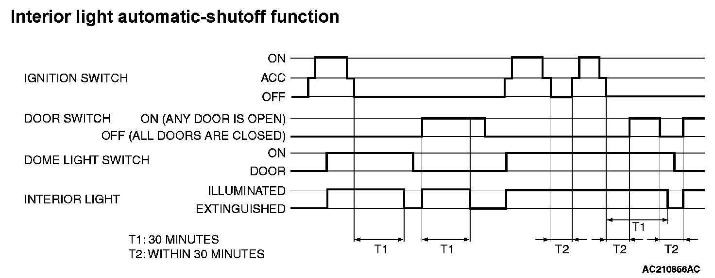 - When the ignition switch is turned off and one of the door switches remains open for 30 minutes continuously, the interior lights will go off automatically.