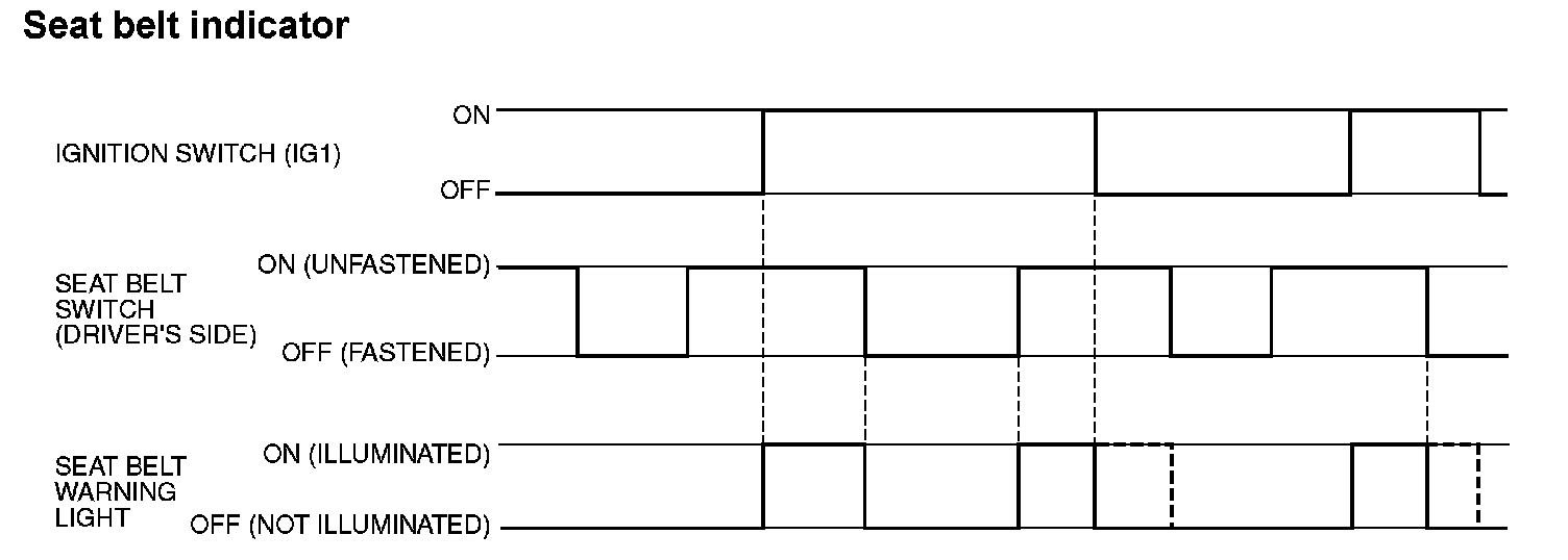 - The seat belt indicator illuminates when the seat belt switch is turned on (driver's seat belt is not fastened) with the ignition switch "ON".