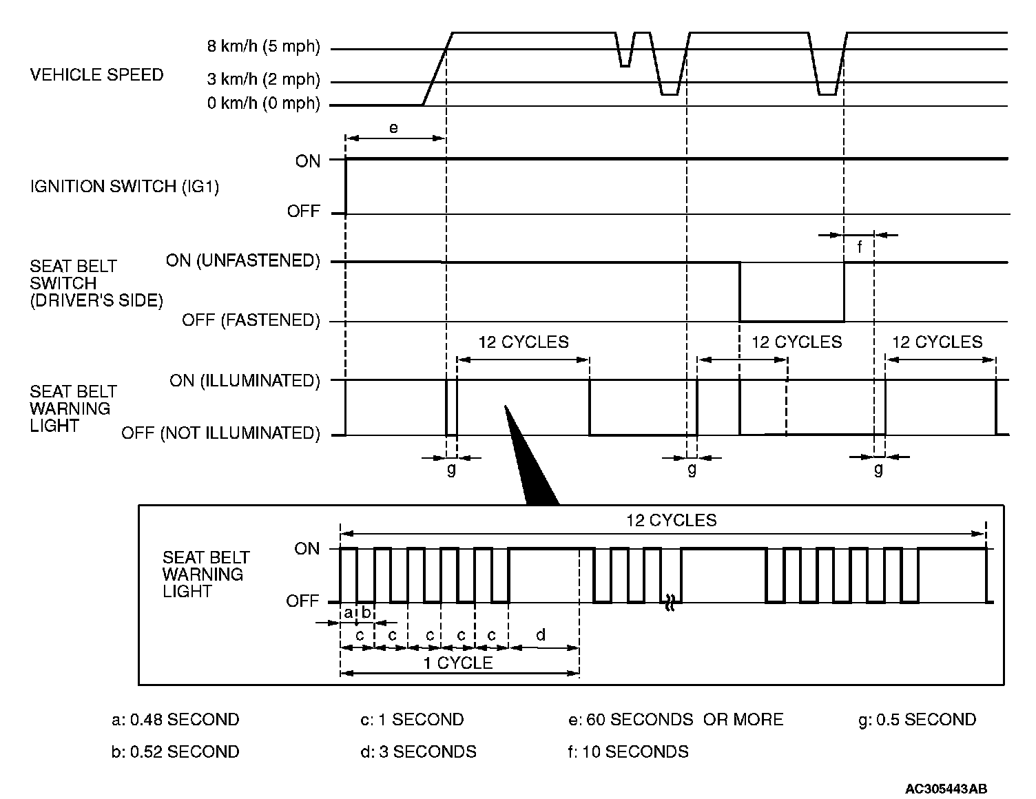 a. The vehicle speed has reached 8 km/h (5 mph) while the seat belt switch is turned on (driver's seat belt is not fastened) with the ignition switch "ON".
