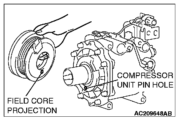 Line up the pin hole on the compressor unit with the field core projection and attach.