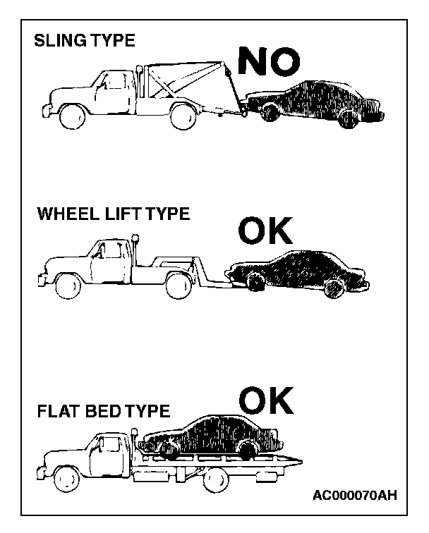 CAUTION: This vehicle cannot be towed by a wrecker using sling-type equipment; otherwise the bumper may become deformed. If this vehicle is towed, use wheel lift or flat bed equipment.