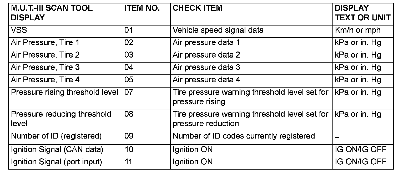 The following items can be read by the scan tool from the TPMS receiver input data.