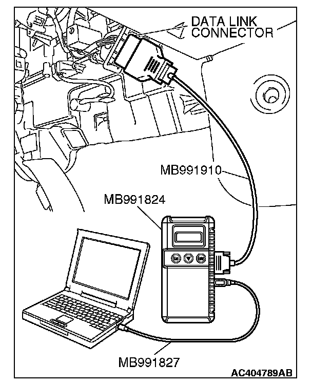 CAUTION: To prevent damage to scan tool MB991958, always turn the ignition switch to the "LOCK" (OFF) position before connecting or disconnecting scan tool MB991958.