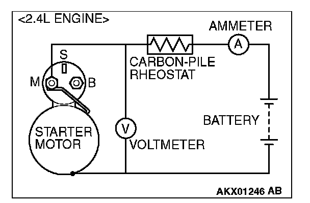2. Connect a test ammeter (100-ampere scale) and carbon pile rheostat in series between the positive battery terminal and starter motor terminal.
