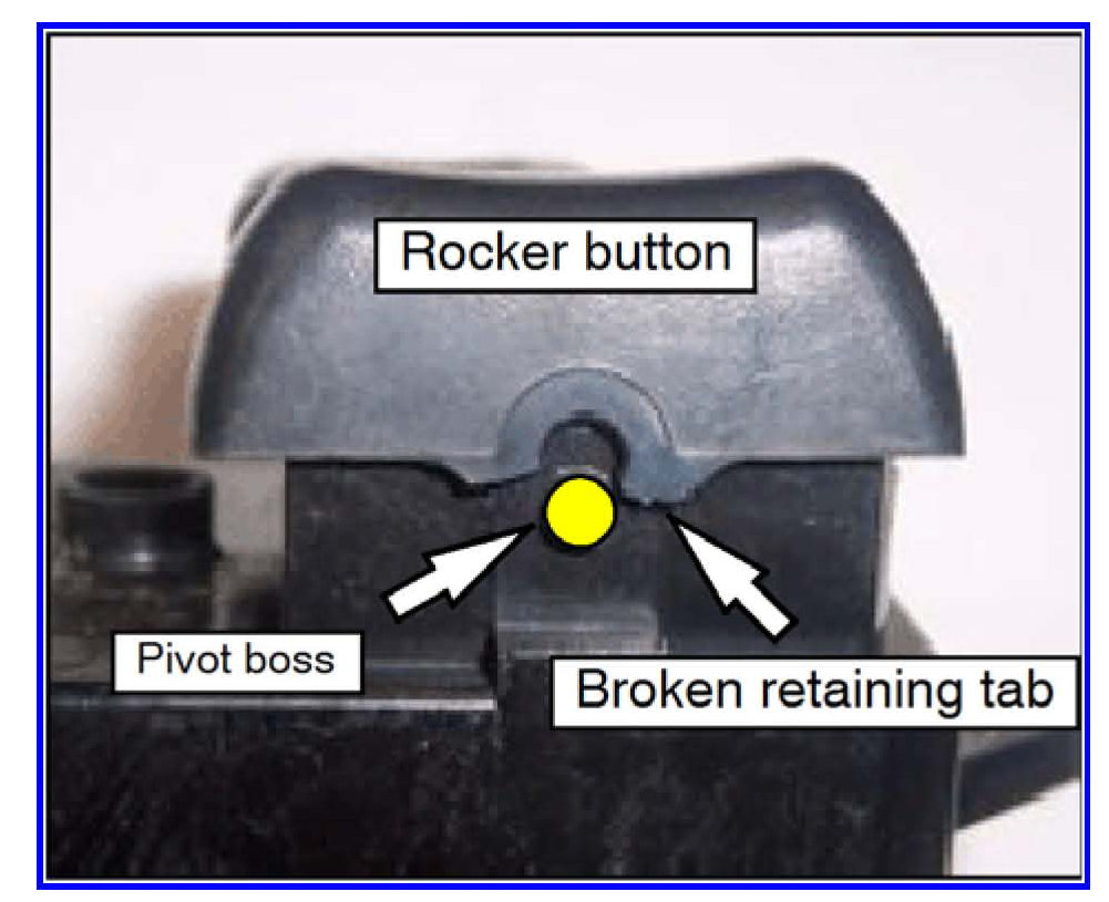 The driver's side central door lock switch rocker button is now available through spare parts. It is no longer necessary to replace the entire switch assembly for a broken switch rocker button. This TSB provides the part number and instructions for installation of a new driver's central door lock switch rocker button.