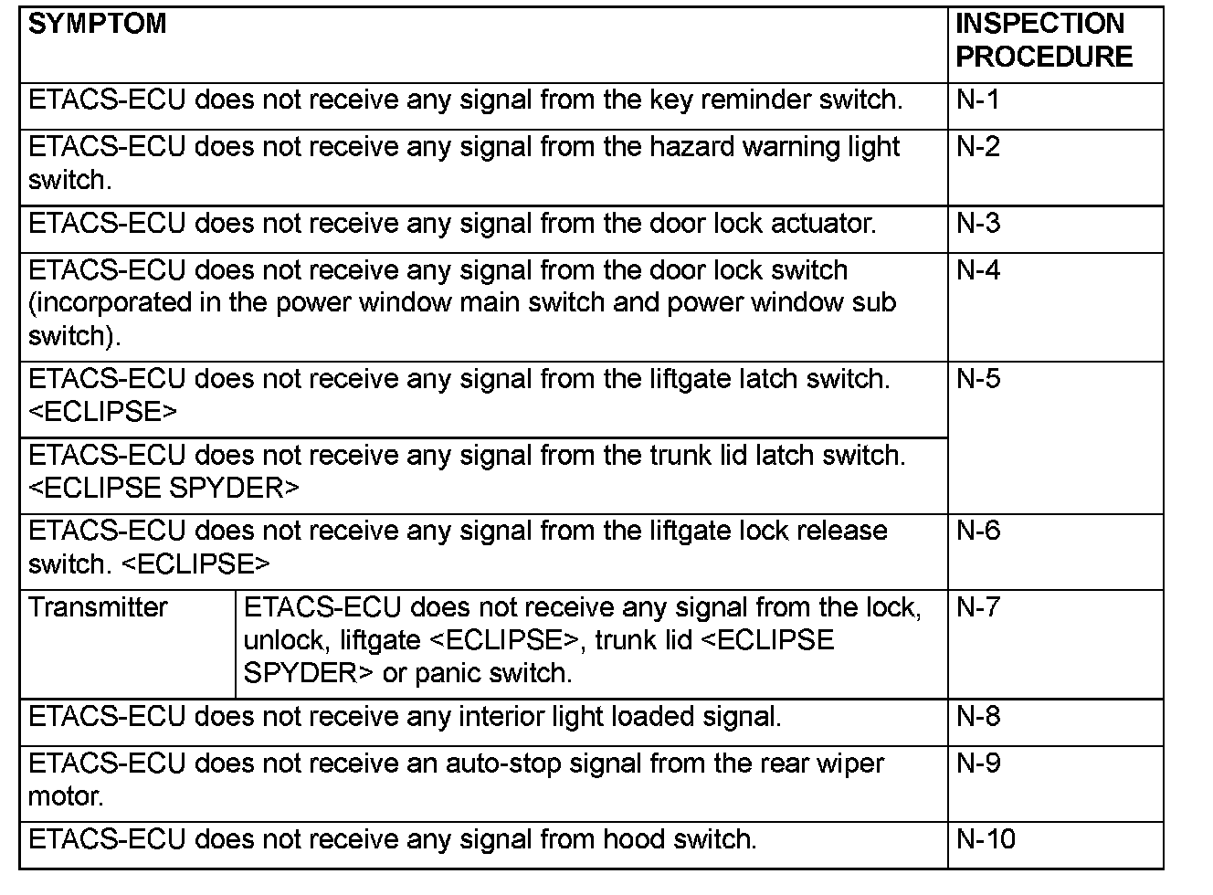 If a problem is found in the Data List inspection, observe the table below.