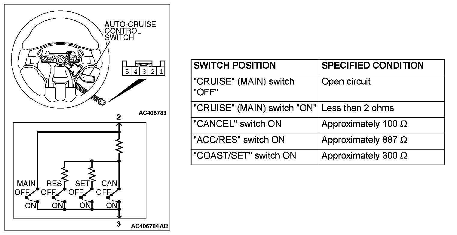 2. Measure the resistance between terminal 2 and terminal 3 when each of the "COAST/SET" "ACC/RES" "CANCEL" and "CRUISE" (MAIN) switches is pressed. If values measured at the time each switch is pressed correspond to those in the table below the resistance values are correct.