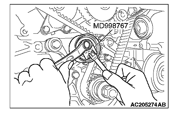4. Use special tool MD998767 to push the tensioner pulley into the timing belt, then temporarily tighten the center bolt.