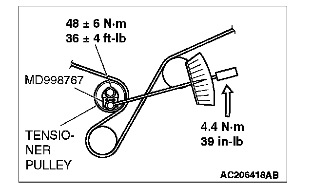 6. Loosen the center bolt of the tensioner pulley. Use special tool MD998767 and a torque wrench to apply the tension torque to the timing belt as shown in the illustration. Then tighten the center bolt to the specified torque.