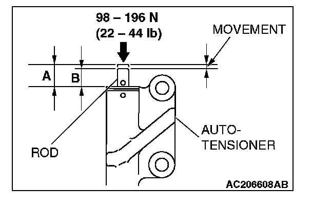 3. While holding the auto-tensioner with your hand, press the end of the pushrod against a metal surface (such as the cylinder block) with a force of 98-196 N (22-44 pounds) and measure how far the pushrod is pushed in.