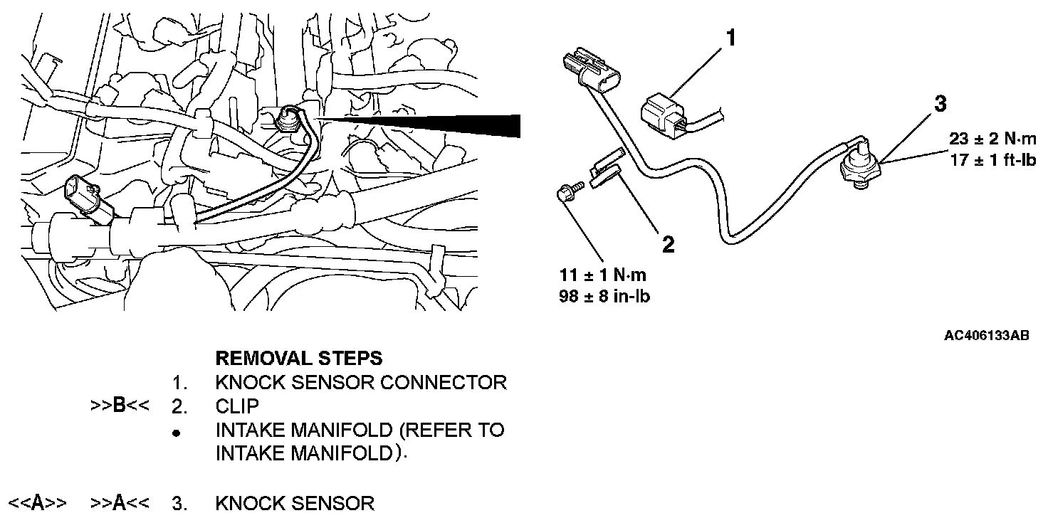 CAUTION: When the knock sensor replacement is performed, use scan tool MB991958 to initialize the learning value. (Refer to Initialization Procedure for Learning Value in MFI Engine).