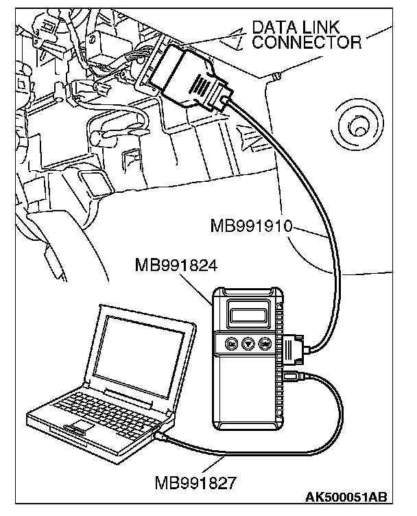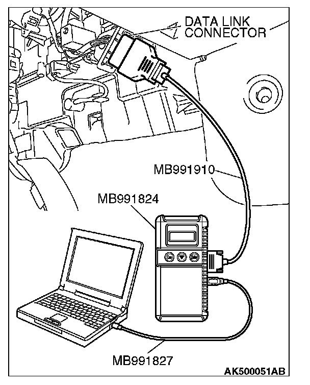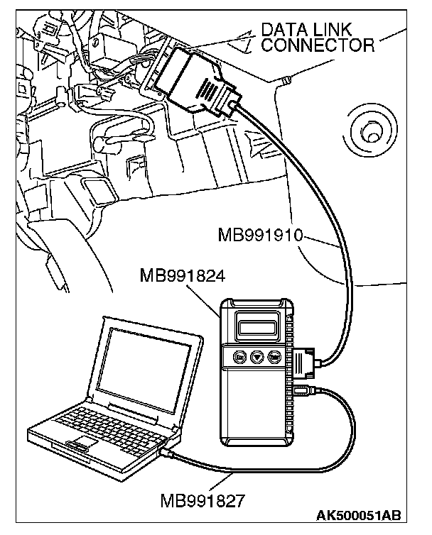 CAUTION: To prevent damage to scan tool MB991958, always turn the ignition switch to the "LOCK" (OFF) position before connecting or disconnecting scan tool MB991958.
