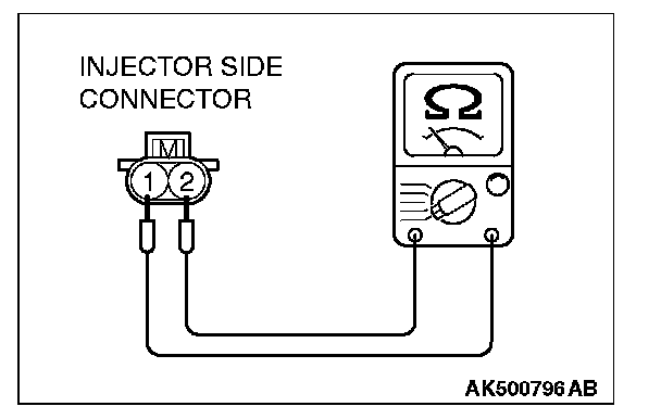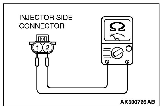 3. Measure the resistance between injector side connector terminal No. 1 and No. 2.