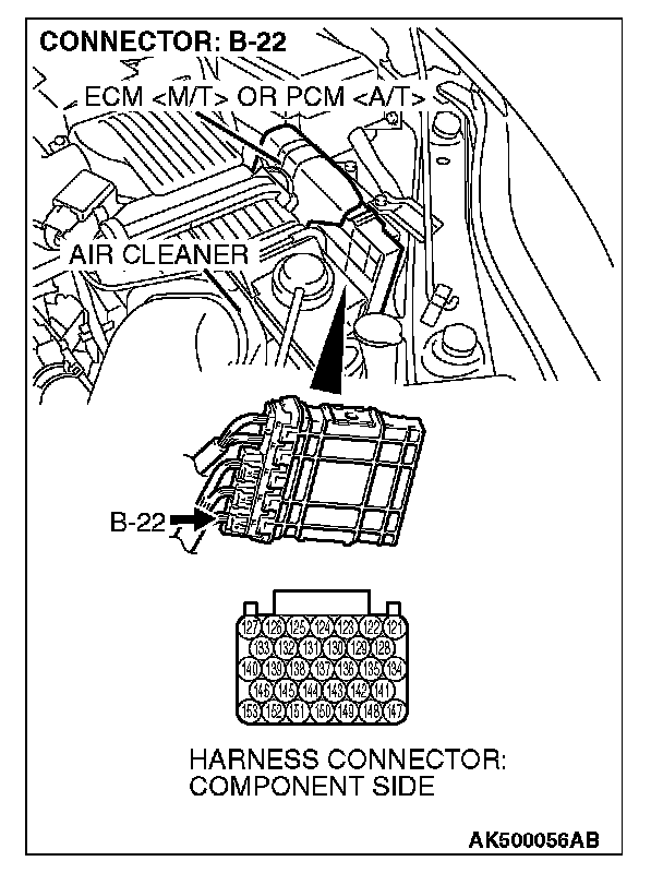 STEP 14. Check harness connector B-22 at ECM [M/T] or PCM [A/T] for damage.