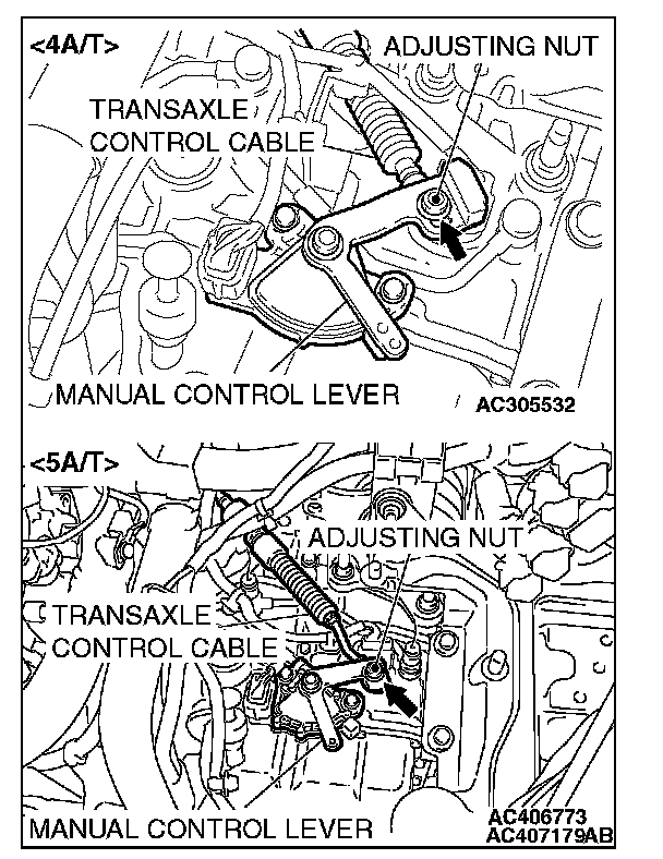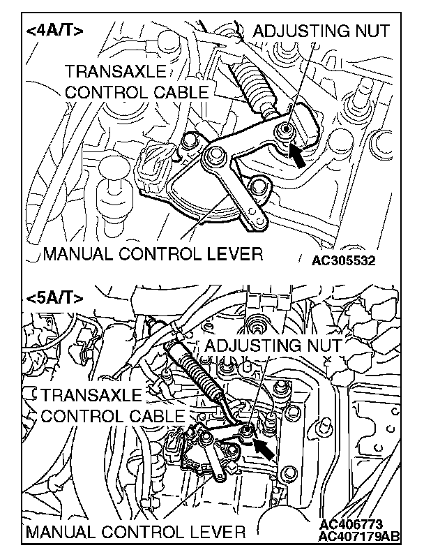 6. Gently push the transaxle control cable in the direction of the arrow, until the cable is taut. Tighten the adjusting nut.