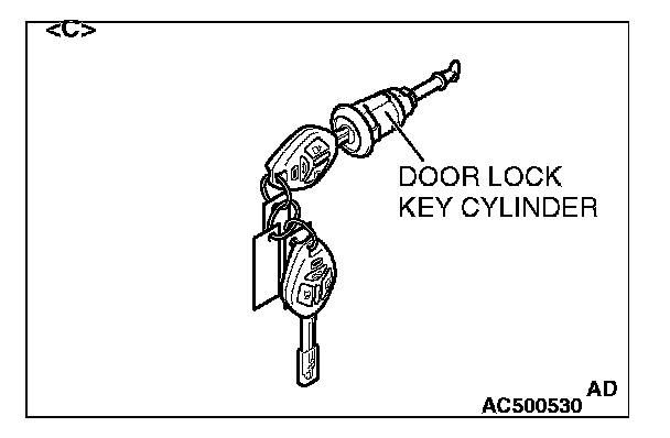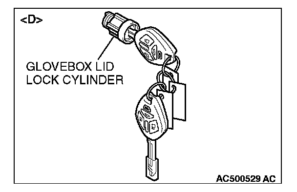 - When replacing the components by the door lock key cylinder of illustration ]C[ or the glove box lid lock cylinder of illustration ]D[, do not register the encrypted code with the bar code on the ignition key which is supplied to each lock cylinder simultaneously.