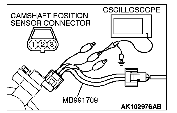 1. Disconnect the camshaft position sensor connector, and connect the test harness special tool (MB991709) between the separated connector (All terminals should be connected).