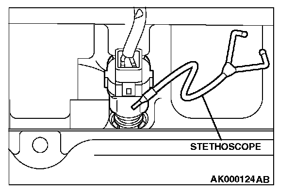 Using a stethoscope or long blade screwdriver,check the operation sound ("tick-tick-tick") of injectors during idling or during cranking. Check that as the engine speed increases, the frequency of the operating sound also increases.