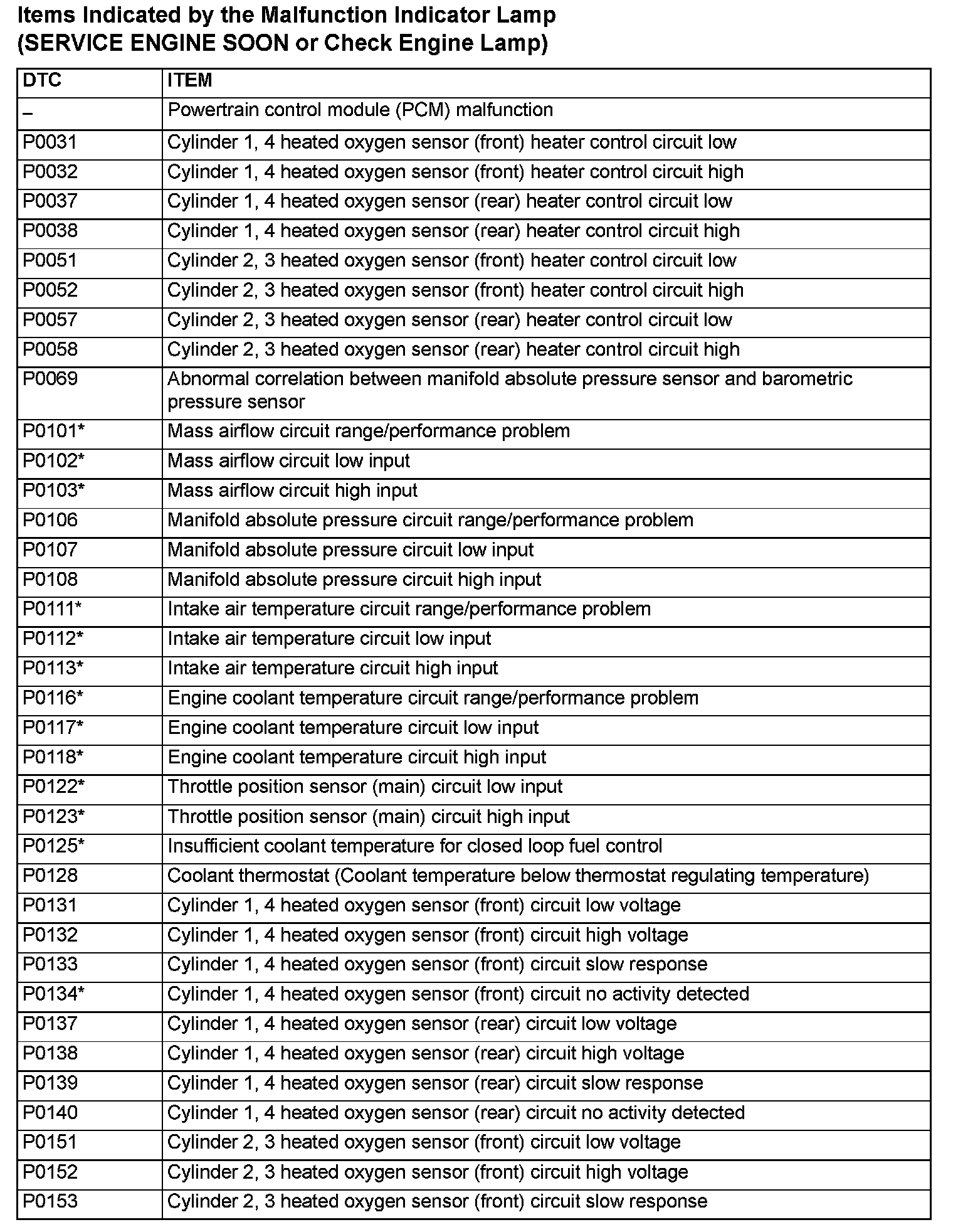Items Indicated by the Malfunction Indicator Lamp (SERVICE ENGINE SOON or Check Engine Lamp)