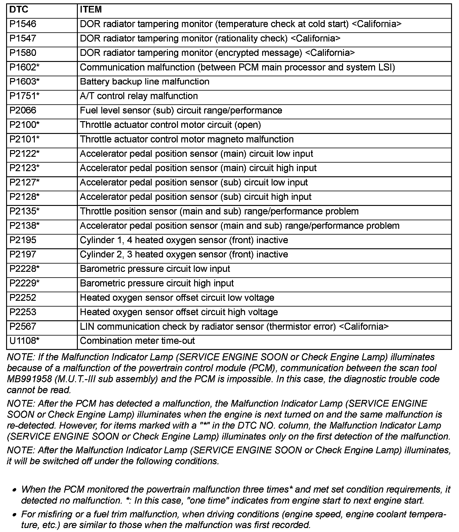 Among the on-board diagnostic items, Malfunction Indicator Lamp (SERVICE ENGINE SOON or Check Engine Lamp) illuminates to notify the driver of an emission control malfunction. However, when an irregular signal returns to normal and the powertrain control module judges that it has returned to normal, the Malfunction Indicator Lamp (SERVICE ENGINE SOON or Check Engine Lamp) will switch off.