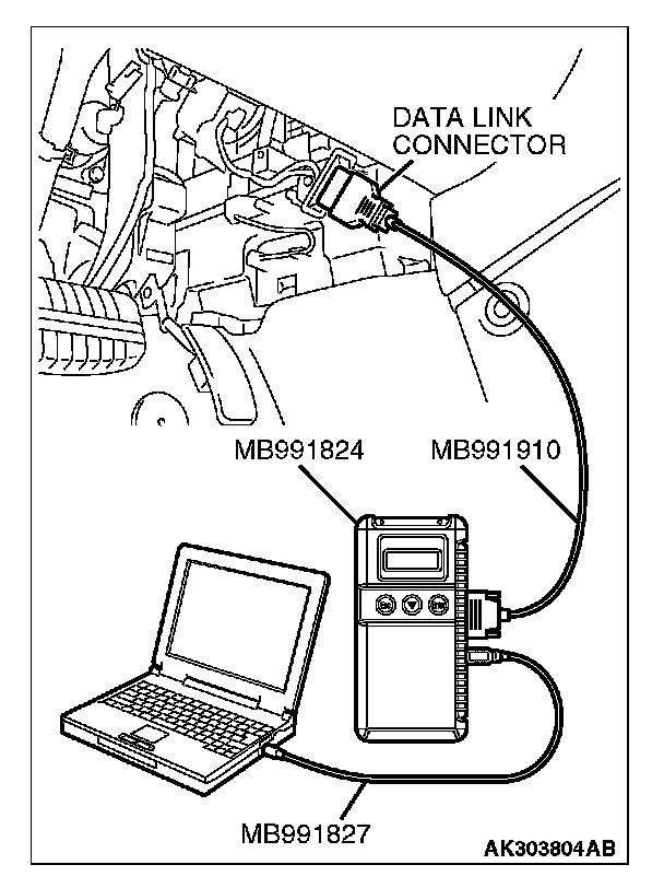 CAUTION: To prevent damage to scan tool MB991958, always turn the ignition switch to the "LOCK" (OFF) position before connecting or disconnecting scan tool MB991958.