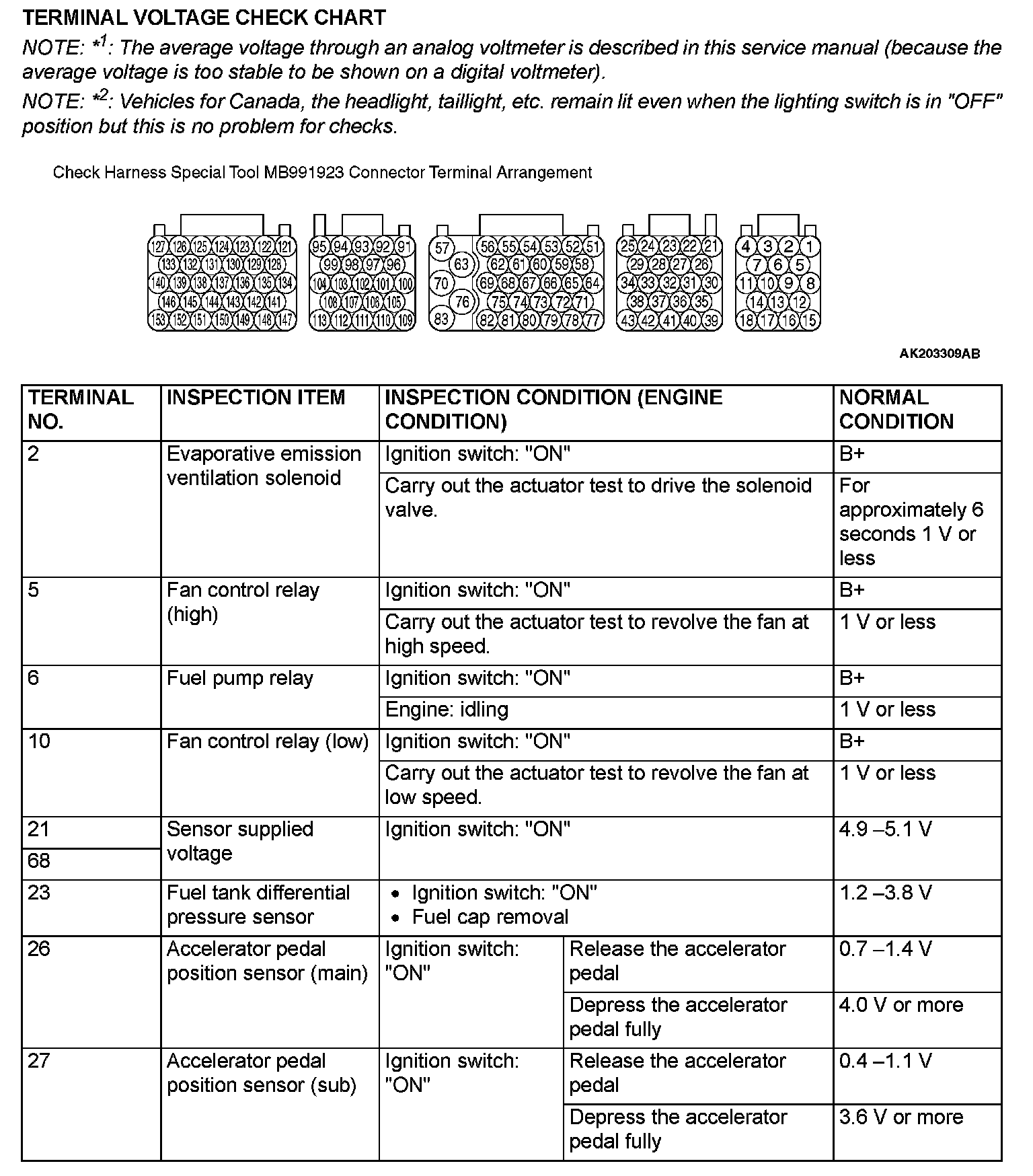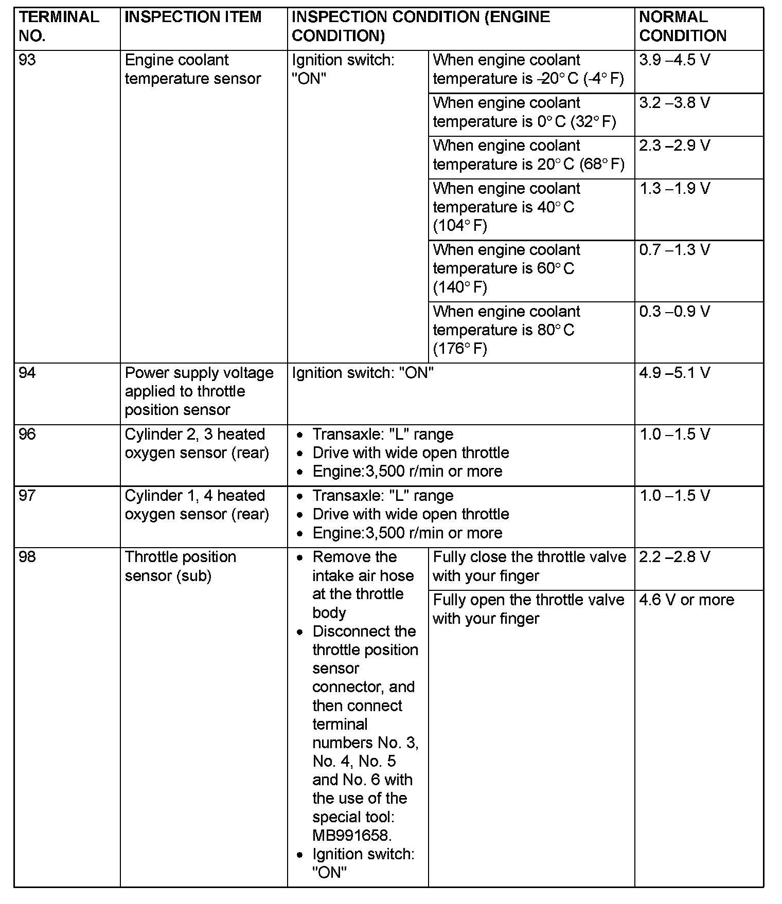 CHECK AT THE POWERTRAIN CONTROL MODULE (PCM)1. Disconnect the PCM connectors B-19, B-20, B-21, B-22 and B-23, and connect check harness special tool MB991923 between the PCM connectors.